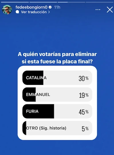 Para sorpresa de todos, en las encuestas aparecía Furia como la nominada más votada para dejar la casa, a diferencia de lo que sucedió los últimos meses, que siempre era la más querida. En la historia que subió Fefe a Instagram, Furia tenía el 45% de los votos en contra, mientras que Catalina la seguía con el 30% y Emmanuel con el 19%.