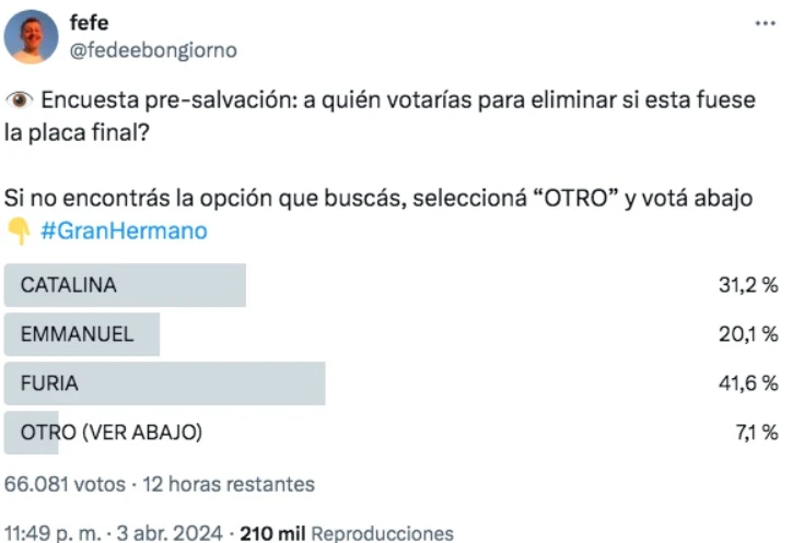 Mientras que, en la encuesta que hizo Fefe en su cuenta de X, Furia tenía el 41,6% de los votos en contra, la seguía Catalina con el 31,2% y atrás estaba Emmanuel con el 20,1% en contra.