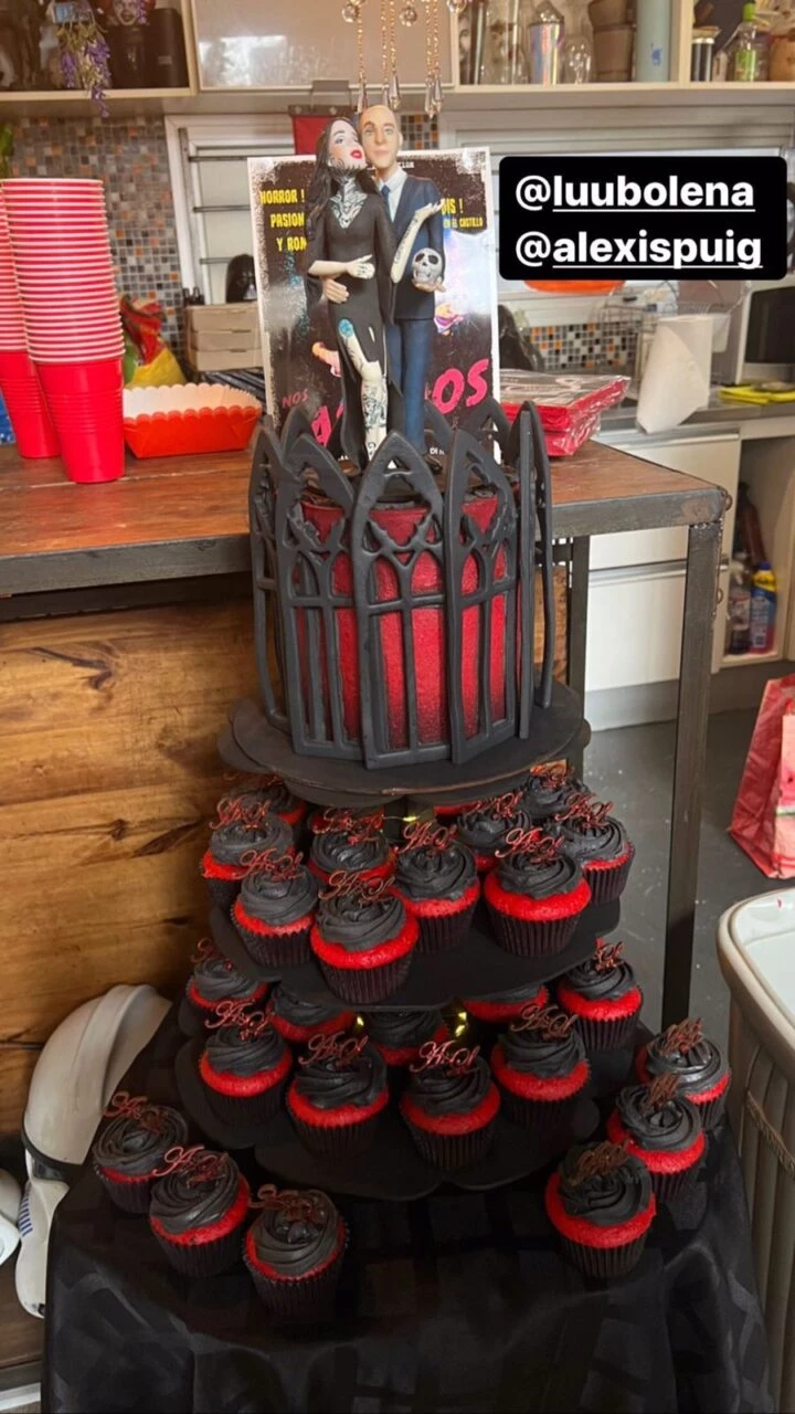 La torta también llevaba detalles como la representación de la estructura de un castillo y cupcackes red decorados con crema negra, culminando con las iniciales de ambos.