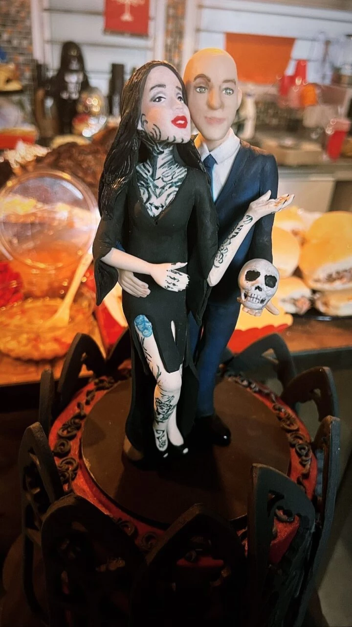 Inspirada en Los Locos Adams, los novios quedaron representados con toda la impronta que los caracteriza: ella con un vestido negro, luciendo sus tattoos, y él con un traje azul oscuro y portando una calavera en la mano.