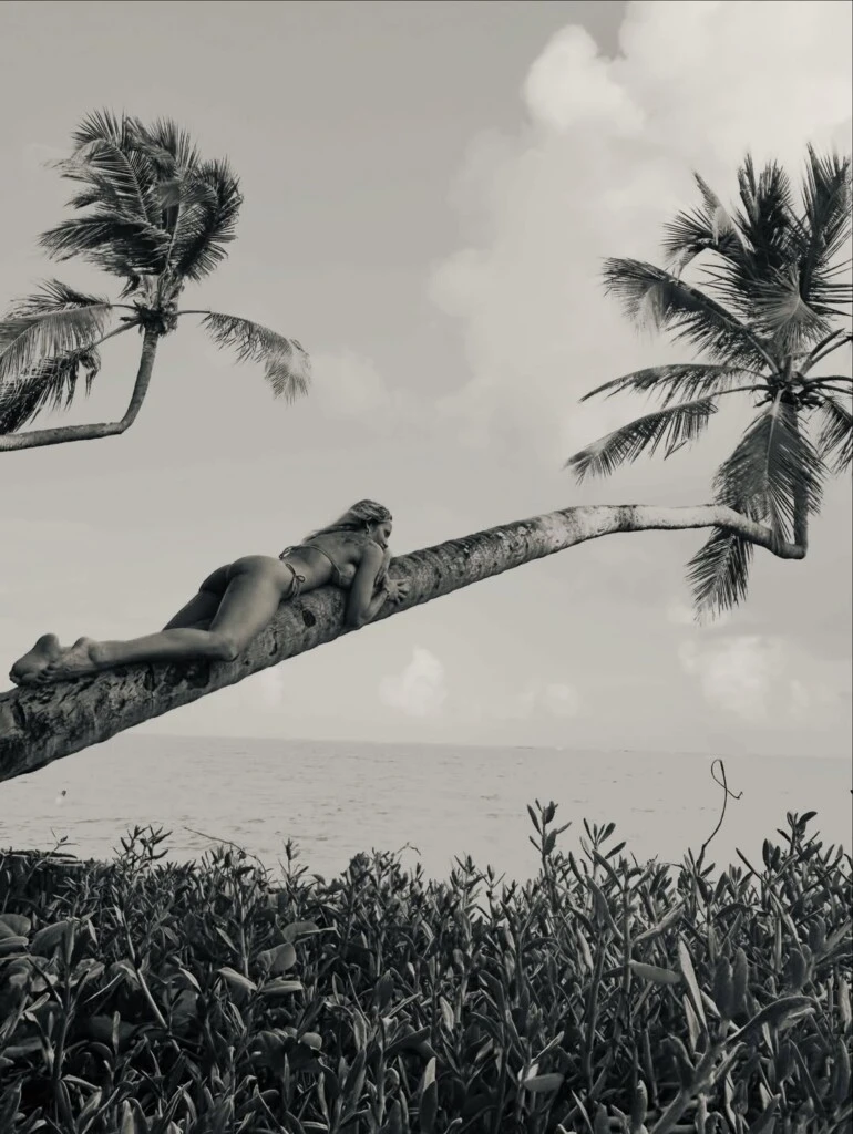 En otra imagen, se la ve recostada sobre una palmera inclinada hacia el mar, rodeada por un cielo azul intenso y vegetación exuberante, transmitiendo una sensación de calma y conexión con el entorno.
