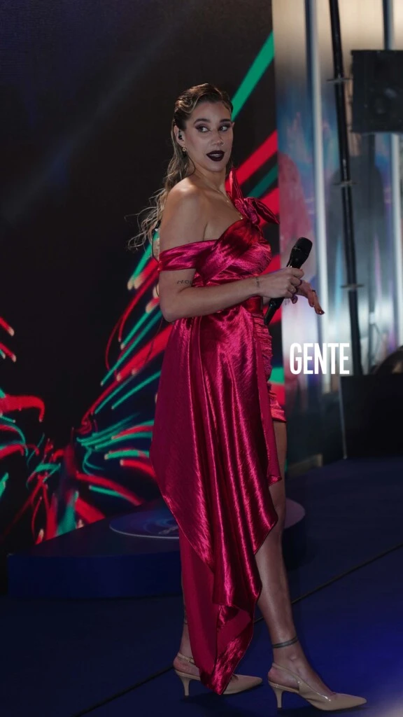 Con energía arrolladora, Juliana "Furia" Scaglione entró a la alfombra azul con un vestido rojo brillante, medias del mismo color y anteojos negros.