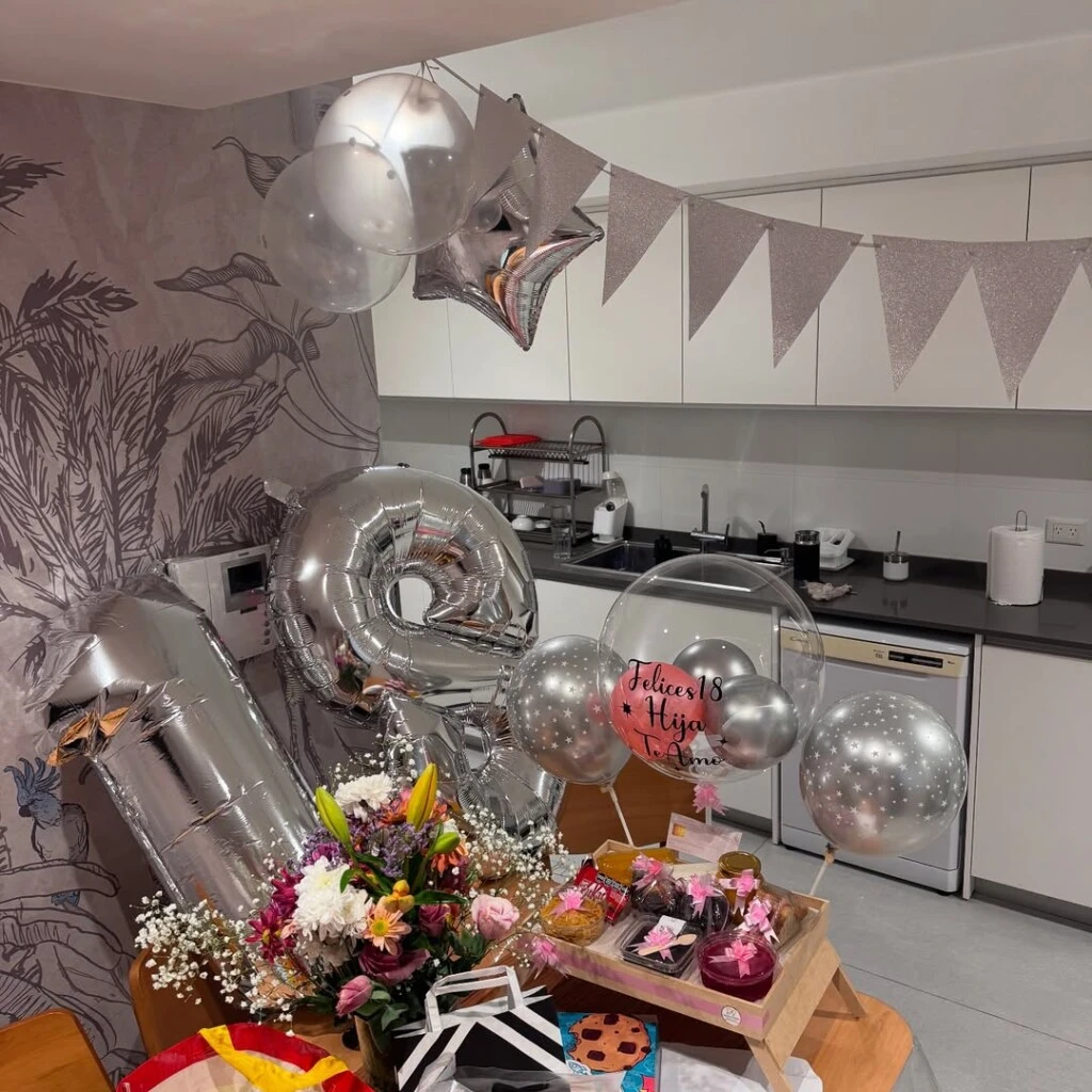Sobre el desayuno, se pudo ver que al despertar la cumpleañera recibió una increíble bandeja llena de cosas ricas para comer y mucho amor, cartas y globos decorativos.