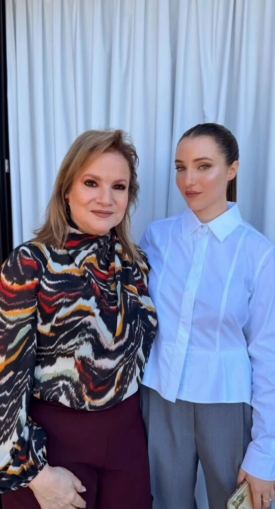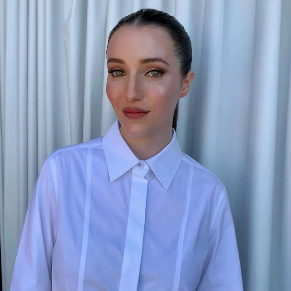 El beauty look acompañó esa estética depurada. Llevó el cabello recogido en una cola tirante, que dejó el rostro completamente despejado, y un maquillaje en tonos tierra con acabado luminoso que resaltó sus facciones de manera natural. Los labios en nude y la piel con efecto glow completaron una imagen moderna y delicada.