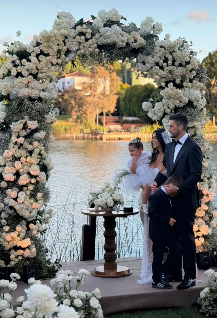 Las fotos de los cuatro juntos, enmarcados por el enorme arco floral y con el lago de fondo, se convirtieron rápidamente en algunas de las imágenes más celebradas de la boda.