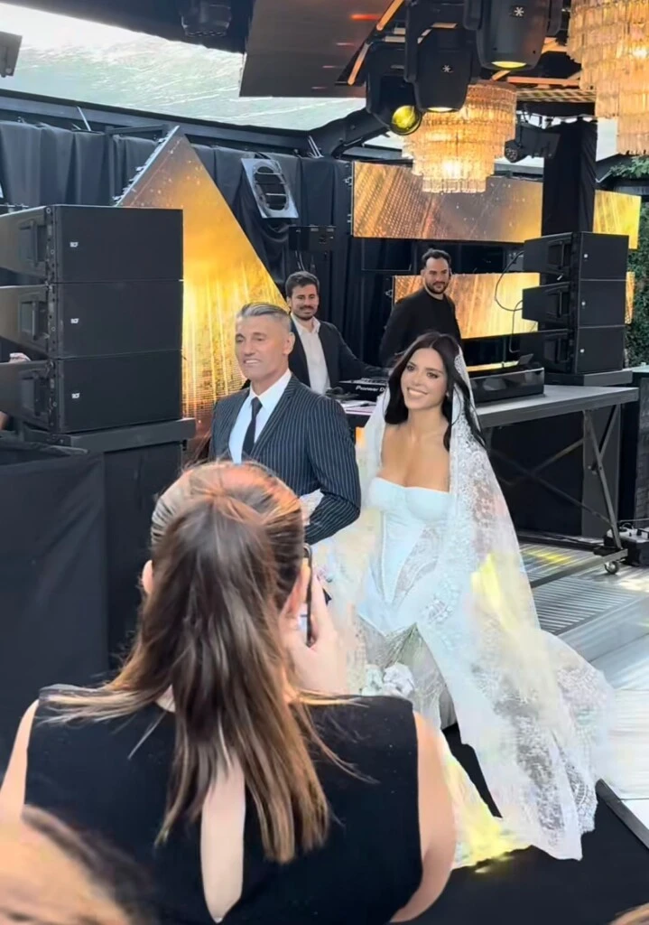 Más tarde, durante la fiesta, la novia cambió su look por un segundo vestido blanco con brillo, más cómodo y festivo, ideal para bailar y disfrutar del festejo. El diseño, de mangas largas y tela luminosa, acompañó el clima de celebración de la noche.