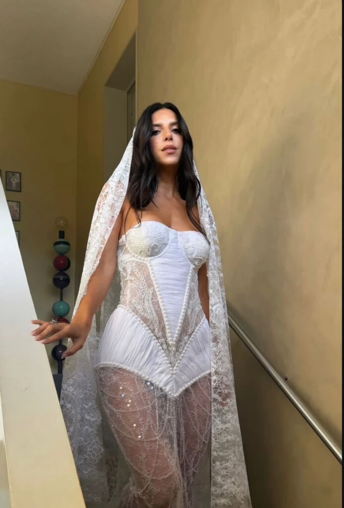 El modelo, de inspiración romántica y sensual a la vez, marcaba la cintura con una estructura tipo corset y continuaba con una falda de tul bordado con transparencias. Lo completó con un largo velo de encaje que caía desde su cabeza y acompañaba el movimiento del vestido, creando una imagen etérea al caminar hacia el altar.