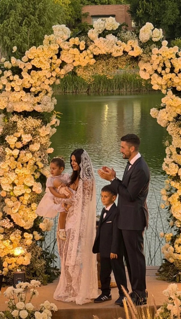 En varias de las imágenes que circularon en redes se los vio acompañando a los novios frente al altar. En una de las postales más tiernas, Paloma sostuvo a su hija en brazos mientras Felipe y su hijo mayor permanecían a su lado, formando una imagen familiar que conmovió a los invitados.