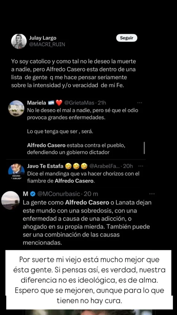 En el caso de Guillermina Casero, en sus redes tuvo lugar un pequeño enfrentamiento con seguidores que en medio de esta difícil situación apuntaron contra el actor y hasta se generó un cruce vínculo a lo político partidario. Junto a varios comentarios en X (ex Twitter), la hija mayor dijo: “Por suerte mi viejo está mucho mejor que esta gente. Si pensas así, es verdad, nuestra diferencia no es ideológica, es de alma. Espero que se mejoren, aunque para lo que tienen no hay cura”.