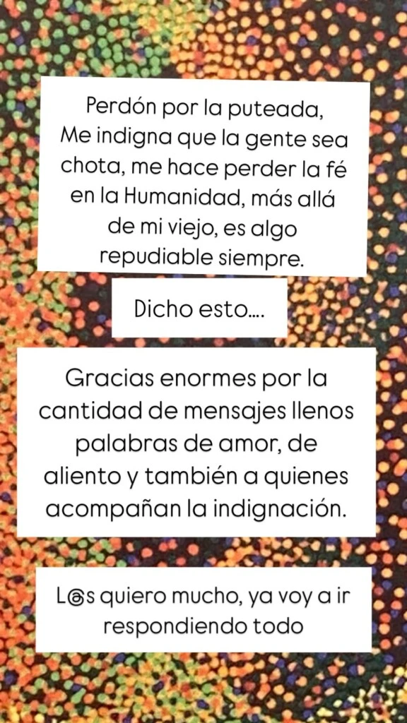 Minutos más tarde, hizo otro posteo remarcando su postura respecto al hate recibido: “Perdón por la puteada. Me indigna que la gente sea chota, me hace perder la fe en la humanidad, más allá de mi viejo, es algo repudiable siempre. Dicho esto… gracias enormes por la cantidad de mensajes llenos de palabras de amor, de aliento y también a quienes acompañan la indignación. Los quiero mucho, ya voy a ir respondiendo todo”.