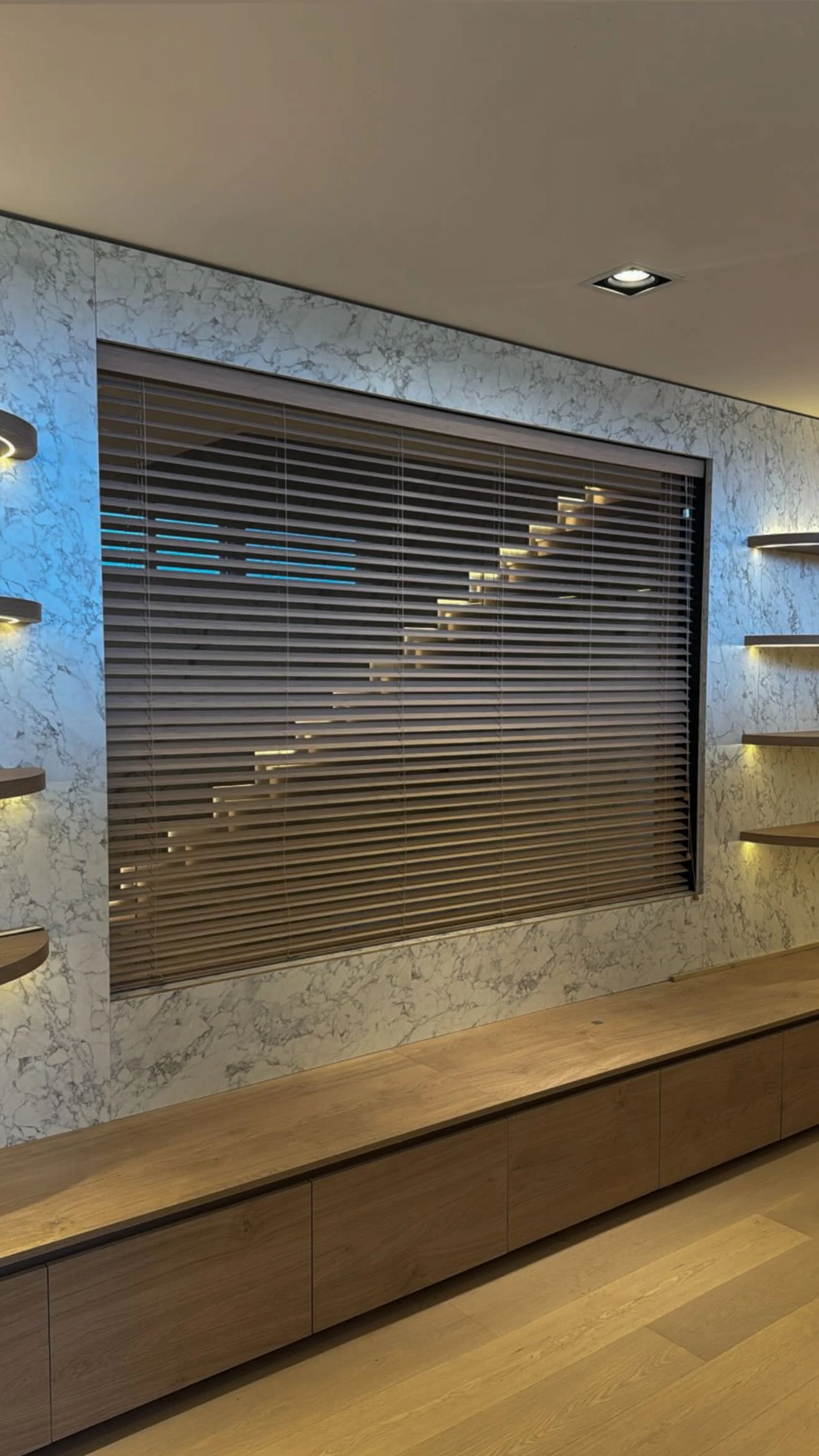 La primera imagen que Wanda subió a sus historias funciona como declaración estética. Se trata de un estar de líneas puras donde el mármol veteado (en placas de gran formato) abraza un ventanal con persianas americanas de madera. Debajo, un mueble corrido de baja altura —también en madera— arma una base cálida y funcional, mientras a ambos lados aparecen estantes flotantes con iluminación puntual que dibuja halos suaves sobre el revestimiento. La suma de materiales nobles y una luz que nunca encandila instala el código general de la casa: lujo sereno, sin estridencias.