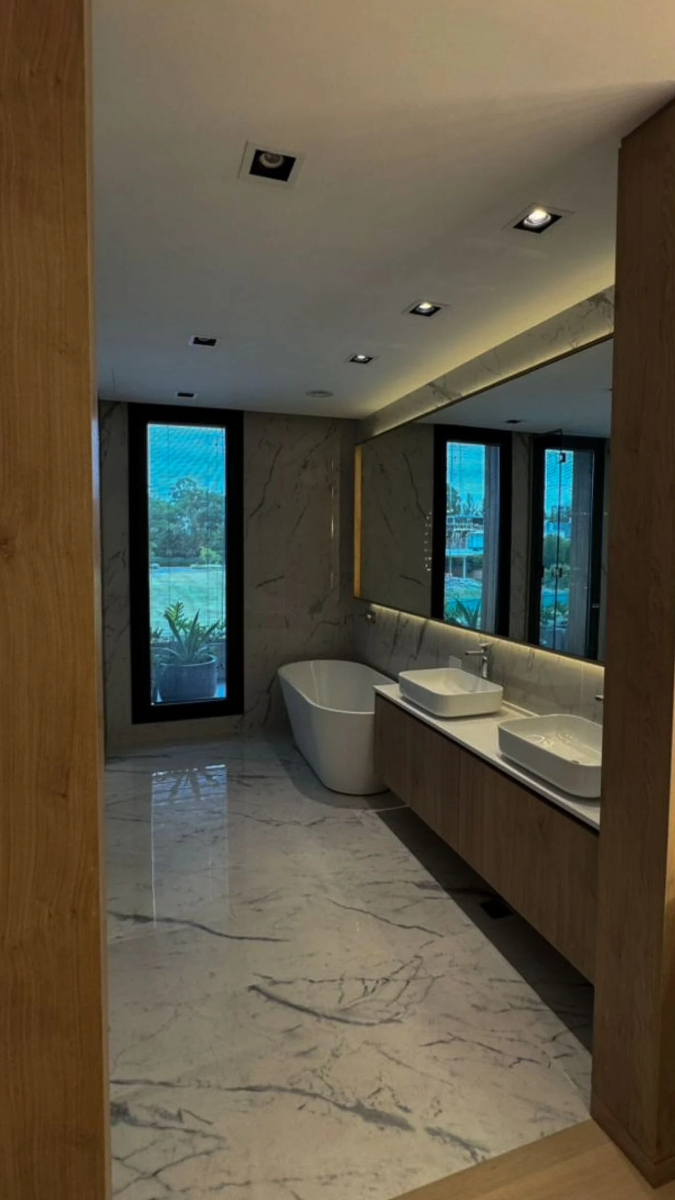 La segunda foto revela el corazón “spa” de la vivienda. El baño combina piso y paredes en mármol con una bañera exenta ubicada en eje con una abertura de carpintería negra, una decisión que enmarca el paisaje y enfatiza la idea de retiro. El frente de mueble —en madera natural— sostiene dos bachas rectangulares de apoyo y un espejo corrido con iluminación perimetral, un recurso de hotel cinco estrellas que, junto a los spots embutidos, genera una atmósfera de bienestar controlado. La lectura cromática es minimalista: grises marmóreos, blancos y madera, una paleta que se repite en el resto de los ambientes.