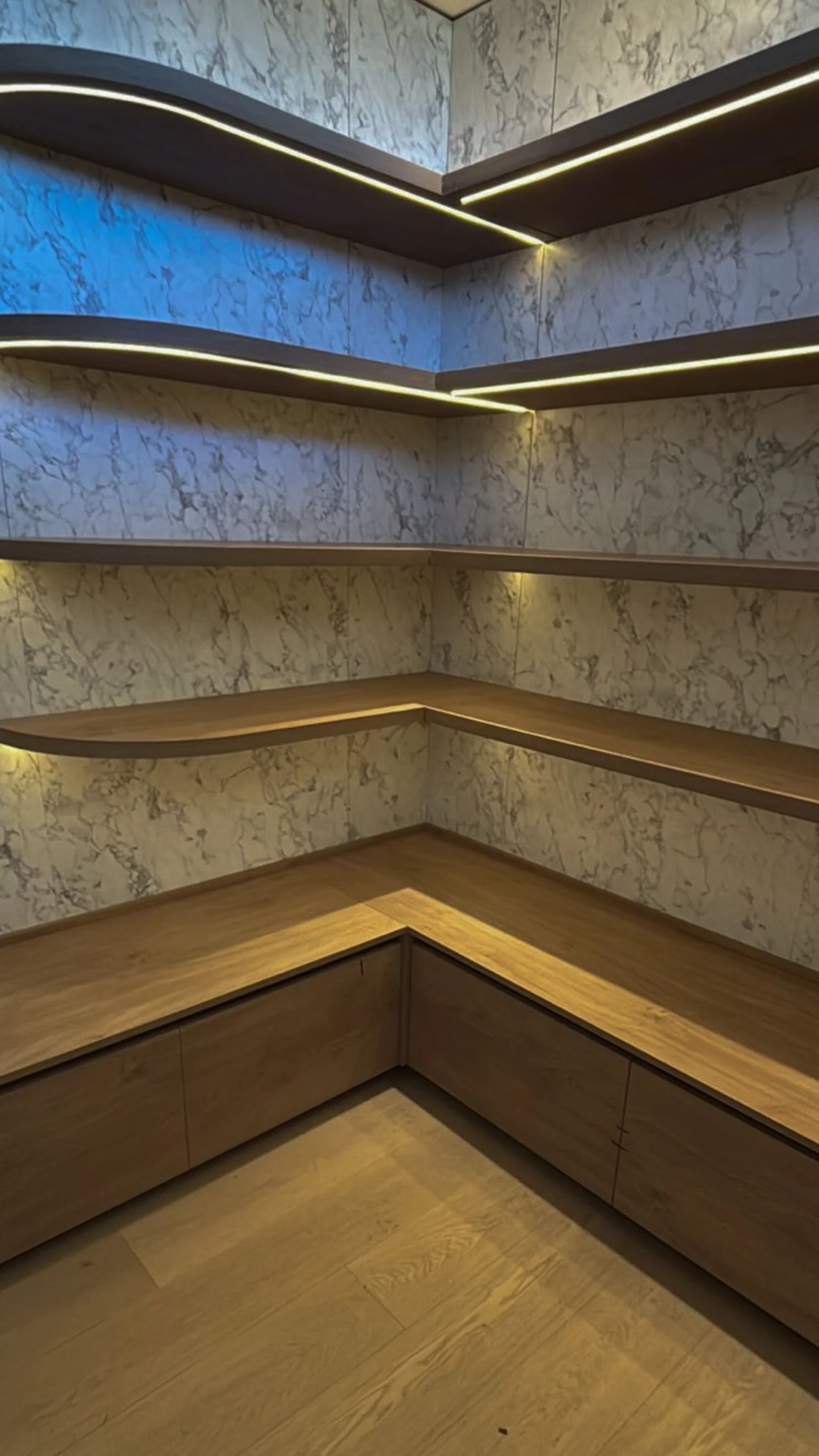 La tercera toma se mete en el universo fetiche de Wanda: el vestidor. El rincón muestra estantes curvos y flotantes —con tiras LED ocultas— que recorren dos paredes y descansan sobre módulos bajos de guardado. Piso de roble claro, juntas limpias y nada de herrajes a la vista completan la apuesta. No es casual: en sus videos más recientes, la conductora ya había anticipado un vestidor de escala XXL, distribuido en varias habitaciones y resuelto con estanterías livianas e iluminación protagonista.