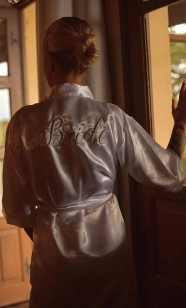 La conductora de LPA se alistó para caminar rumbo al altar y se destacó con una bata de seda bordada con la palabra "bride", novia en inglés". Flor mostró su peinado recogido y un make up super natural.