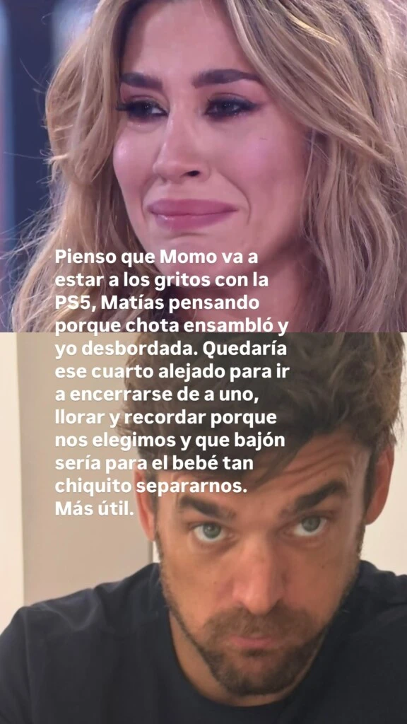 Fiel a su estilo de completa sinceridad, vaticinó posibles dramas para cuando sean cuatro personas en la casa: “Pienso que Momo va a estar a los gritos con la PS5, Matías pensando por qué chota ensambló y yo desbordada. Quedaría ese cuarto alejado para ir a encerrarse de a uno, llorar y recordar por qué nos elegimos y qué bajón sería para el bebé tan chiquito separarnos. Más útil”.