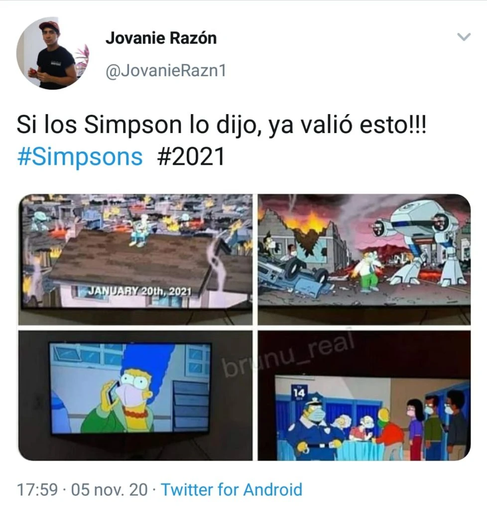 Según los espectadores, para el año que recién comienza lo que viene no parece muy alentador. Incluso datan en enero el primer hecho de unos cuantos que se irán sucediendo. En el capítulo 32, Homero se olvida de ir a votar y el día es el 21 de este mes, fecha en que Joe Biden asumiría la presidencia de los Estados Unidos.