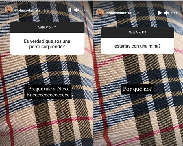 Finalmente Laurita dejó abierta la posibilidad a estar con una mujer y cuando quisieron saber si era una "perra" en la intimidad sentenció: "Preguntale a Nico bueeeeee".