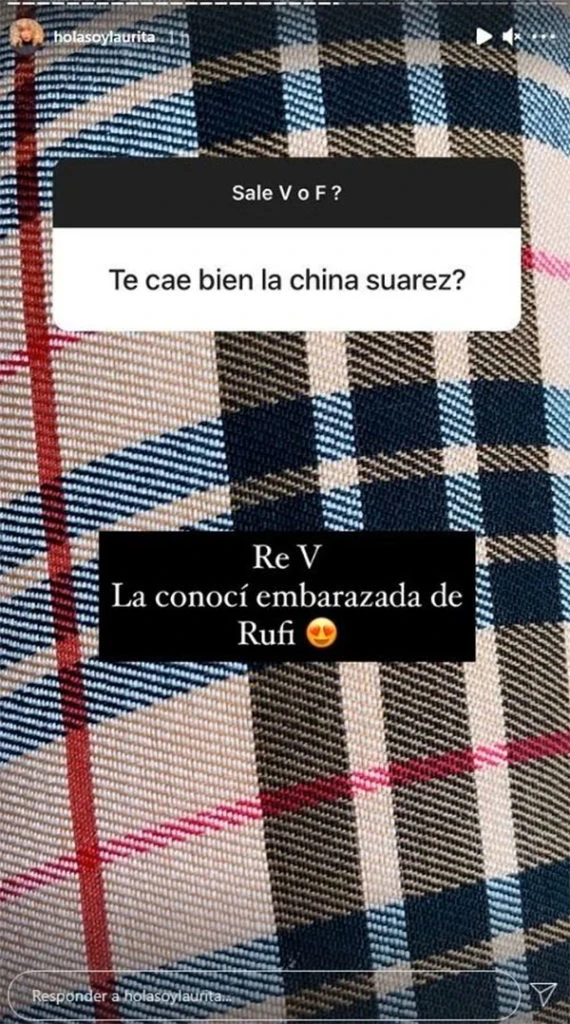 "¿Sale verdadero o falso?", preguntó la conductora y enseguida llegaron las consultas. Y una de ellas fue directa al hueso: "¿Te cae bien la China Suárez?". Sin vueltas, Laurita dijo que sí y reveló cuándo la conoció. "Re verdadero, la conocí cuando estaba embarazada de Rufina", aseguró con un emoji de amor.
