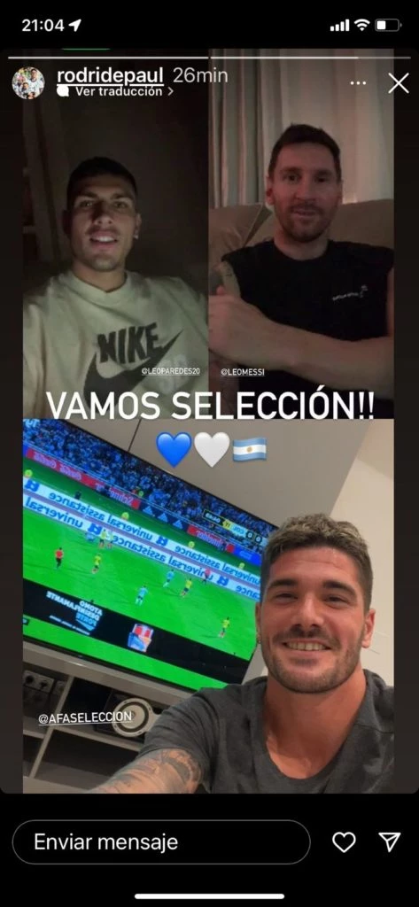 A pesar de no estar presentes en el campo de juego Messi, de Paul y Paredes como todos los argentinos alrededor del mundo dijeron presente compartiendo una fotografía en la que se los puede ver haciendo videollamada y mirando el partido como íntimos amigos.