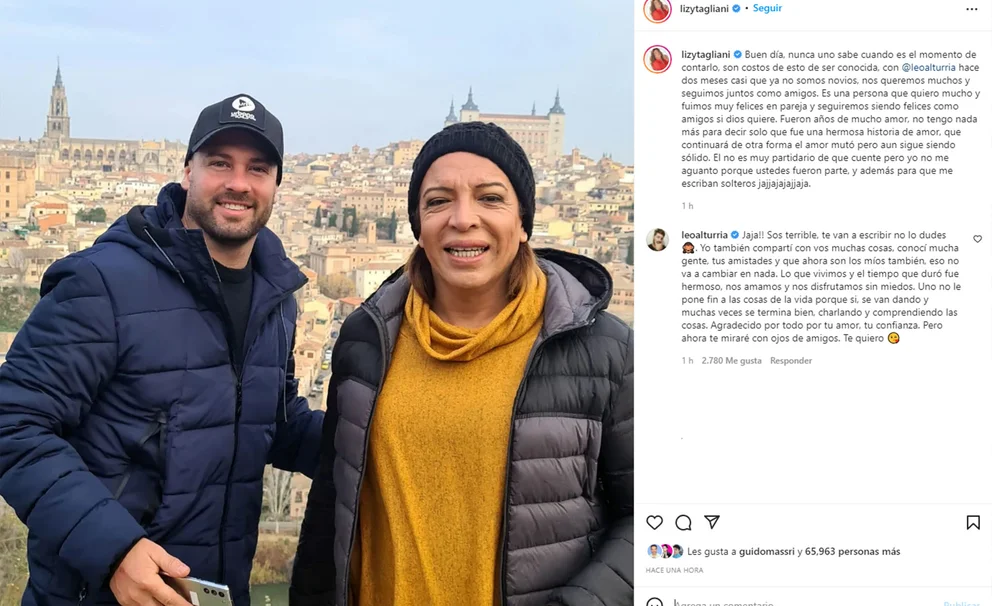 Pero esta no es el único post que hizo Lizy que llamó la atención de sus seguidores. Unos días antes, la conductora compartió una foto junto a su ex pareja, Leo Alturria. Esto levantó rumores de una posible reconciliación, pero no fue así. "No fui yo fue google. Pero amo q suceda, hay amores que no se terminan nunca (NO VOLVI ES UNA FOTO VIEJA)", escribió Tagliani, acompañando a la imagen donde se la ve abrazando cariñosamente a Alturria.
