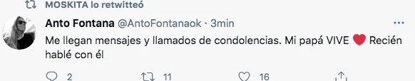 En el medio de lo que parecía una triste noticia, pero que terminó con final feliz, su hija, Antonella Fontana, se refirió al estremecedor momento que vivió apenas empezó a difundirse la falsa noticia: “Me llegan mensajes y llamados de condolecías. Mi papá vive. Recién hablé con él”, escribió en Twitter.