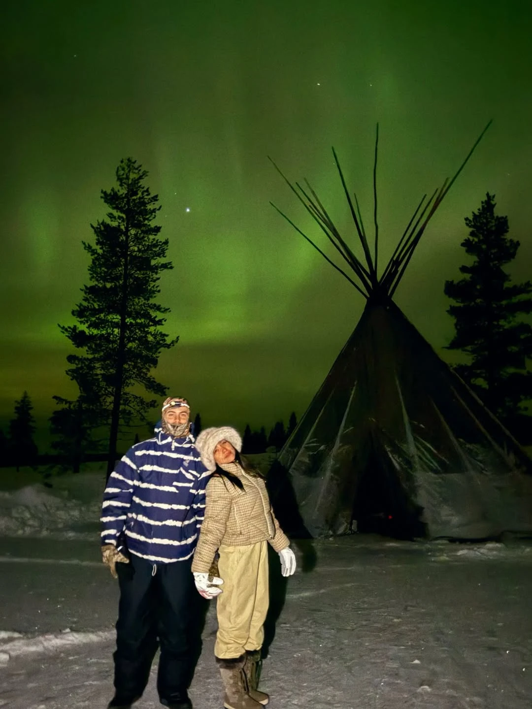 Las imágenes que acompañan el posteo reflejan ese espíritu. María aparece abrigada con ropa térmica, gorros y guantes, en medio de paisajes completamente blancos, bosques nevados y cielos nocturnos teñidos de verde por las auroras boreales. En algunas postales se la ve sobre una moto de nieve, en otras posando frente a una típica construcción local, mientras el fondo natural de Rovaniemi —conocida mundialmente por ser la “ciudad de Papá Noel”— completa la escena de fantasía.