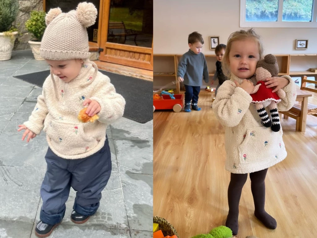 En otras de las imágenes que sus padres compartieron en su cuenta de Instagram, queda al descubierto lo que llevaba puesto Ana García Moritán debajo de su campera. La más pequeña de los hermanos, se cubrió de las bajas temperaturas con un buzo de corderito que tenía flores bordadas, además del gorro de lana tejido y calzas negras.