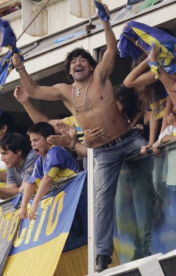 La primera de las imágenes que la diseñadora logró sincronizar con su computadora fue ésta de El Diez colgado en el palco de la Bombonera, festejando un gol mientras ella lo sostiene de la cintura para que no se caiga.