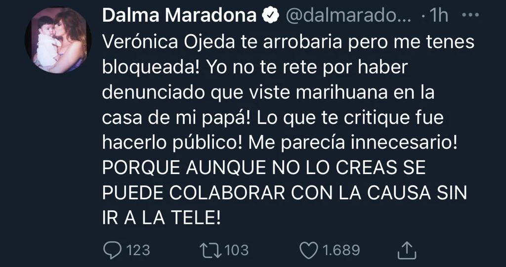 "No te enojes conmigo porque pasaron un audio tuyo apoyando a Luque. Yo no tengo nada que ver", tuiteó luego la hija de Diego mostrando una captura que demuestra que Ojeda la tiene bloqueada.