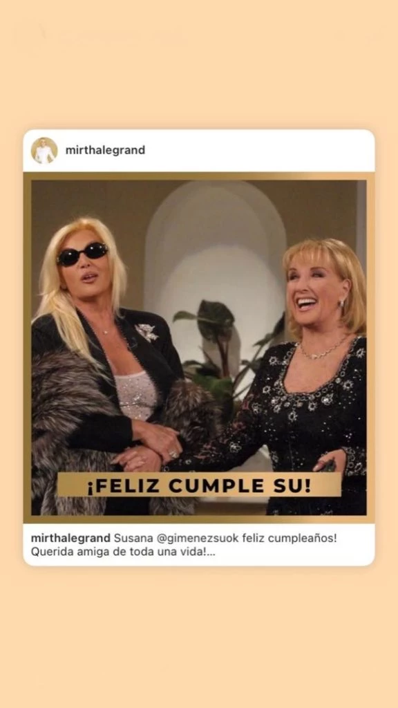 "Querida amiga de toda la vida", le escribió Mirtha Legrand en su cuenta de Instagram y hoy al mediodía la llamó por teléfono y hablaron durante más de 30 minutos. Susana Giménez le preguntó a Mirtha cómo se sentía y la Chiqui le aseguró que está muy bien.