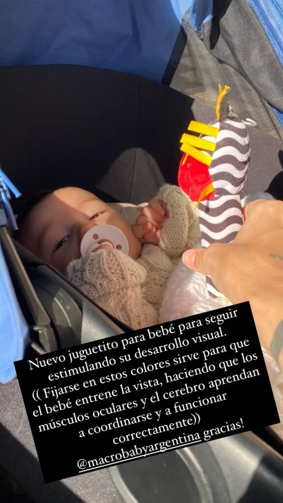 "Nuevo juguetito para bebé, para seguir estimulando su desarrollo visual. Fijarse en estos colores sirve para que el bebé entrene la vista, haciendo que los músculos oculares y el cerebro aprendan a coordinarse y a funcionar correctamente", escribió en una historia la actriz, sumando una tierna imagen de Tao con su nueva adquisición.