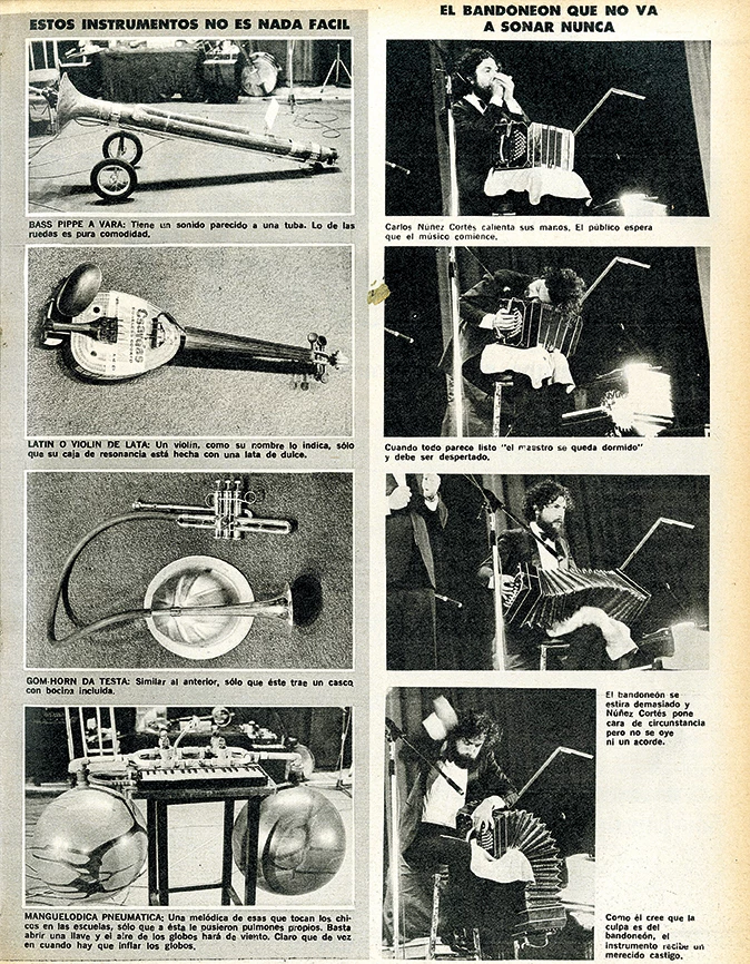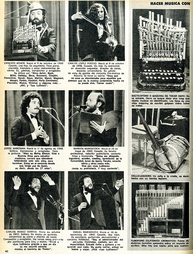 “Ingenio, talento, humor… La fórmula de Les Luthiers no falla nunca”, señalaba la nota de GENTE publicada el 13 de febrero de 1975 (Nº 499), mientras nos mostraba algunos de los instrumentos en los que “hacer música –decía– no es nada fácil”. Y acercaba un “dactilófono” o “máquina de tocar omni”, el “cello-legüero”, un “tubófono cilicónico cromático”, el “bass pippe a vara”, un “latín” o “violín de lata”, el “gom horn da testa” y la “manguelódica pneumática”. Hablamos de algunos de los 92 instrumentos informales que fabricaron a lo largo de su trayectoria. Lógico, no es casual que el nombre de la banda provenga de la voz francesa “luthier”: el artesano que fabrica o repara instrumentos.