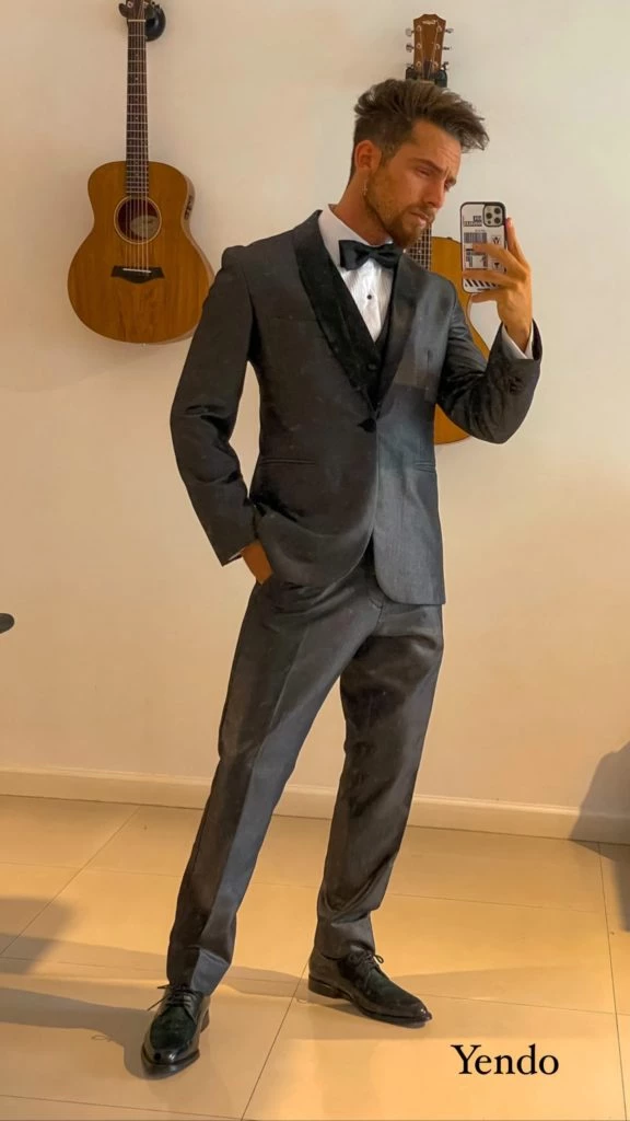 Otro gran invitado es Máximo Espíndola, quien se fotografió con dos guitarras de fondo previo a la boda. El músico optó por un smoking gris con solapa de satén negra y pantalón chupín, chaleco negro ,camisa blanca y moño negro.