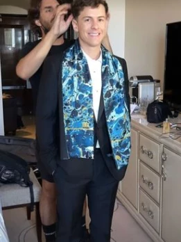 El músico se vistió con un traje clásico color azúl oscuro y camisa blanca. Para descontracturar el atuendo sumó un pañuelo en tonos turquesas degradé haciendo juego con el outfit.