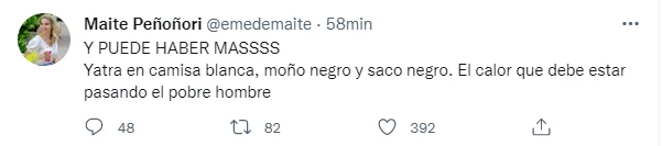 La periodista Maitena Peñoñori, se encuentra cubriendo el minuto a minuto de la gran celebración desde afuera del predio. La mujer contó que ingresó el cantante colombiano Sebastián Yatra vestido con un traje negro con camisa blanca y moño negro.