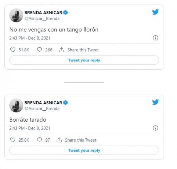 "No me vengas con un tango llorón" y "Borráte, tarado", fueron los sugerentes y enigmáticos tweets de la actriz en la madrugada de este 9 de diciembre tras conocerse la foto del trapero y Emilia.