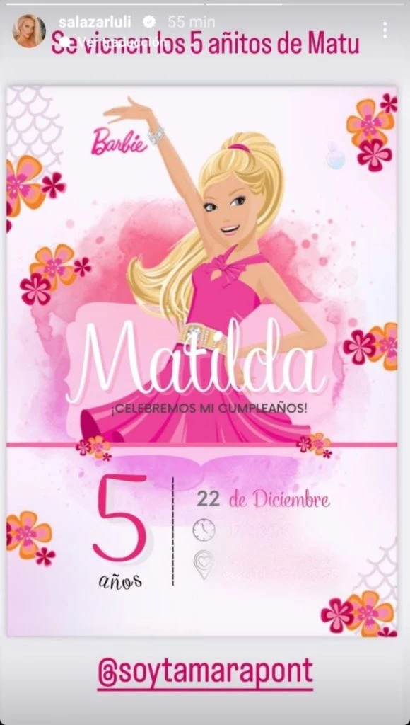 "Se vienen los cinco añitos de Matu", escribió encima de la tarjetita del evento que compartió en sus redes sociales. Con mucho glamour y en tonalidades rosa y blanco, la invitación tiene una muñeca Barbie en el centro y muchas flores.