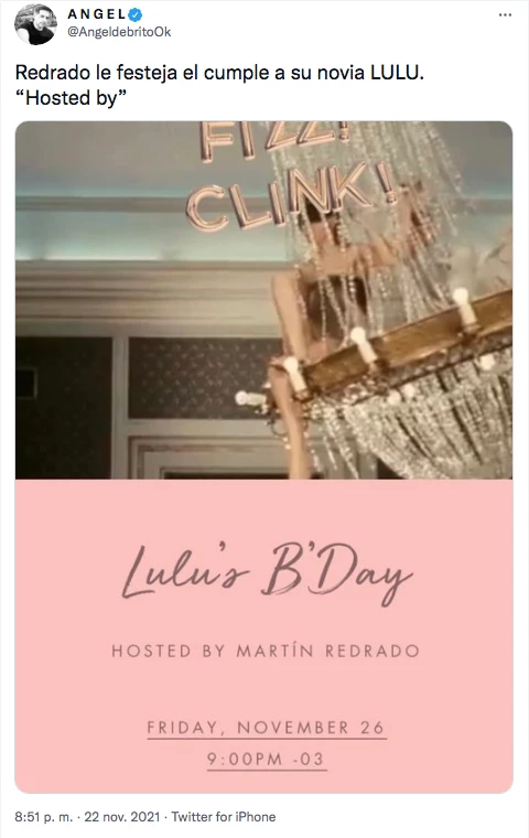 Todo comenzó en el hecho de que el economista comenzó a difundir entre sus contactos la invitación, donde él cumple el rol de anfitrión, de la fiesta de cumpleaños que organizó para Lulú Sanguinetti, su actual pareja luego de un impasse a raíz de sus intentos por reconquistar a Salazar. En el poster del evento se puede leer "Hosted by Martín Redrado", un detalle que confirma su tarea como organizador de la celebración.