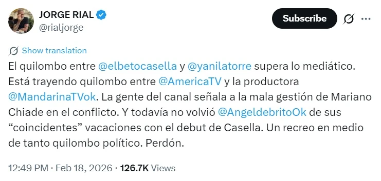 Del otro lado, el contexto que encuadra el estallido es complejo. Rial venía deslizando, en radio y redes, que la llegada de Beto Casella con Mandarina encendió internas de sueldos, egos y egresos de figuras dentro del canal, además de una supuesta bajada para no tocar el enfrentamiento de Casella con Yanina Latorre tras los repudiables dichos de Joe Fernández sobre un bailarín del Teatro Colón. En X, sintetizó su lectura con un post que mencionaba a Mandarina, a su responsable Mariano Chihade y a las “coincidentes” vacaciones de Ángel de Brito con el debut de Casella.