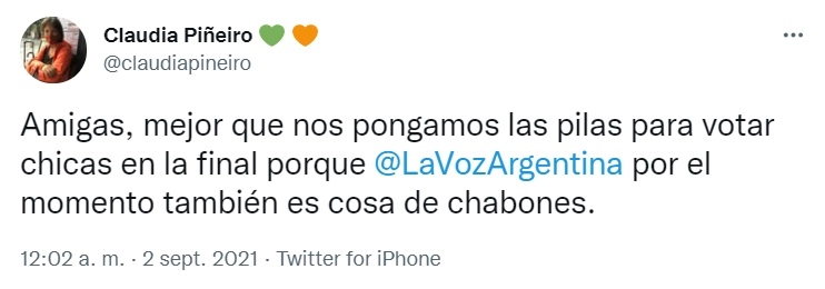 En su cuenta de Twitter manifestó: "Amigas, mejor que nos pongamos las pilas para votar chicas en la final porque La Voz Argentina por el momento también es cosa de chabones", dijo en referencia a su intención de alentar a quienes votan para que lo hagan sobre las candidatas que siguen en camino y así "cortar con la racha" de las anteriores ediciones donde ganaron varones.