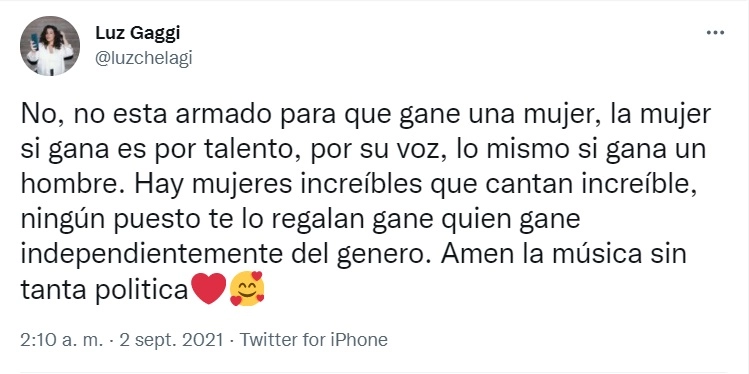 Luego de ver las grandes repercusiones que se generaron tras la última emisión del programa, Luz recurrió a su cuenta de Twitter para expresar su mirada sobre el debate en torno a si debe o no ganar una mujer esta edición del exitoso formato de talentos musicales ya que en las anteriores temporadas los ganadores fueron varones.