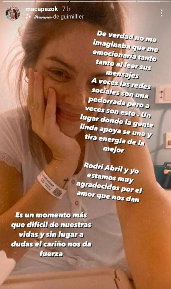 "Rodri, Abril y yo estamos muy agradecidos por el amor que nos dan. Es un momento más que difícil de nuestras vidas y su cariño nos da fuerzas", cerró su mensaje Macarena, quien solo hace una semana se convirtió en mamá.