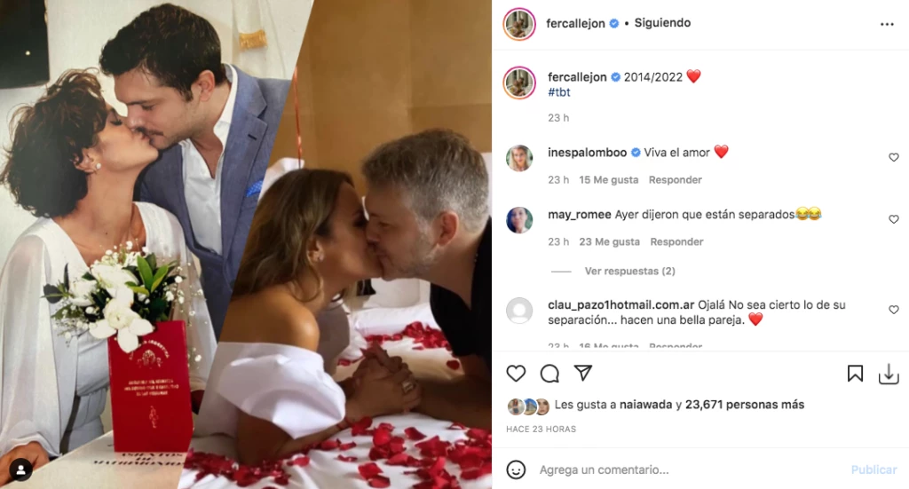 “2014/2022”, escribió adjuntando un corazón y una postal doble en donde se puede ver una instantánea del casamiento y otra de la actualidad. Como a algunos les generó dudas, decidió ser más clara este viernes al subir un video en donde se los puede ver caminando juntos por la calle. “Les mandamos besitos, buen finde”, escribió en la filmación musicalizada con la canción “Love” de Michael Bublé.