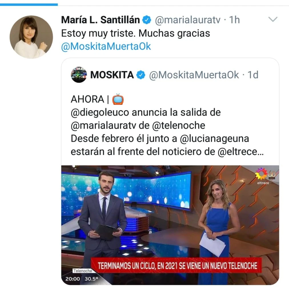 La salida de María Laura Santillán de la pantalla de Eltrece, pero sobre todo de Telenoche, causó sorpresa y confusión por su rapidez y desprolijidad. A medida que pasaban las horas se iban agregando nuevos condimentos. El más significativo fue el que ocurrió el viernes 18, día en que la conductora del noticiero tendría que haberse despedido al aire de su público.