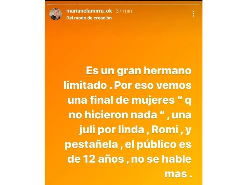 Fiel a su estilo frontal, Marianela hizo explosivas declaraciones: “Es un ‘Gran Hermano’ limitado. Por eso vemos una final de mujeres ‘que no hicieron nada’, una Juli por linda, Romi y Pestañela, el público es de doce años, no se hable más”.