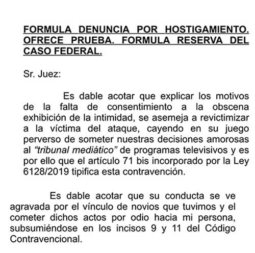 "Es dable acotar que explicar los motivos de la falta de consentimiento a la obscena exhibición de la intimidad se asemeja a revictimizar a la víctima del ataque, cayendo en su juego perverso de someter nuestras decisiones amorosas al ‘tribunal mediático’ de programas televisivos", dice en la denuncia.