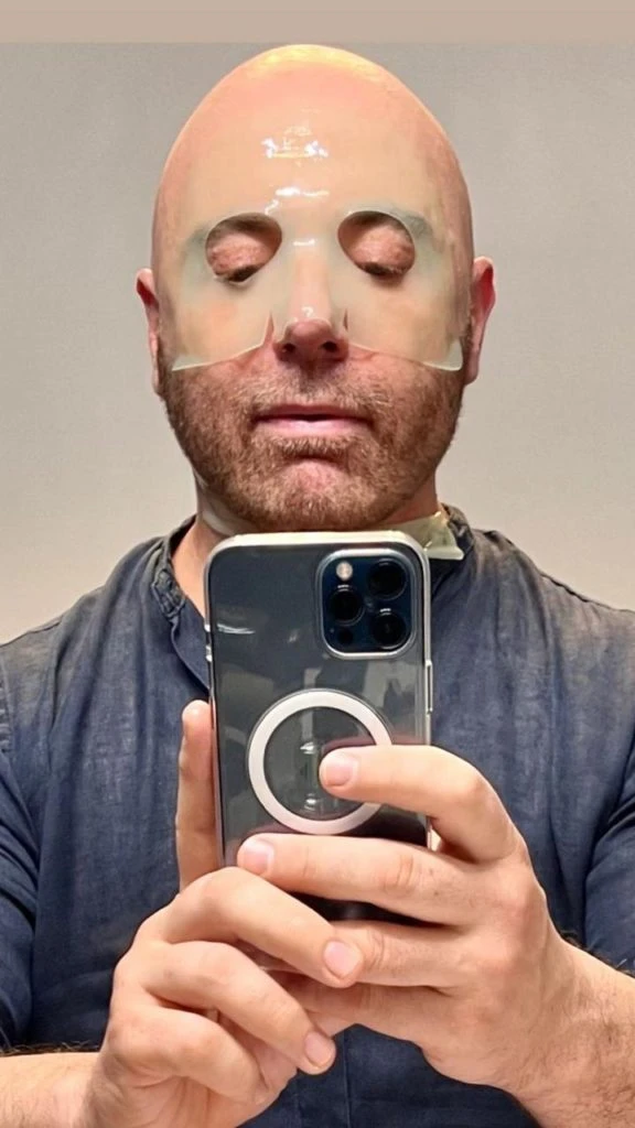 Por su barba, él sólo se colocó la parte superior de una máscara de hidrogel muy humectante que otorga brillo y luz a la piel.