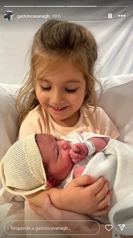 La segunda postal que el también periodista y productor televisivo subió a sus redes es una muy similar a la que su mujer compartió en sus historias de Instagram. Es que Gastón publicó una dulce imagen de Isa, su hija mayor, sosteniendo a upa a la pequeña Aurora.