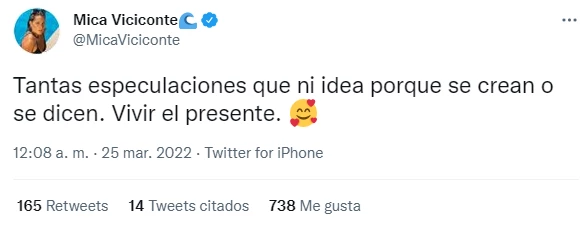 Por su parte, Mica bajó la intensidad de la polémica con un tuit: "Tantas especulaciones que ni idea por qué se crean o se dicen. Vivir el presente”, escribió la pareja de Fabián Cubero en sus redes sociales.