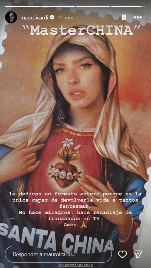 En lugar de responder con otro texto largo, el delantero optó por la provocación visual. Compartió una imagen editada de la China Suárez caracterizada como una suerte de virgen o santa, con estética religiosa, corazón visible en el pecho y una estética que remitía a las estampitas clásicas. En la parte superior de la imagen se leía en letras destacadas: “MasterCHINA”, una clara continuidad de la chicana que ya había lanzado horas antes contra el programa que conduce Wanda.